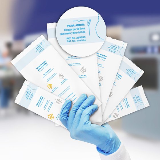 Bolsa de papel grado médico con porosidad controlada, hidrófugo para esterilizar con Gas o Vapor, con tratamiento antibacteriano, con reactivo químico impreso y sistema de apertura lateral con hilo.