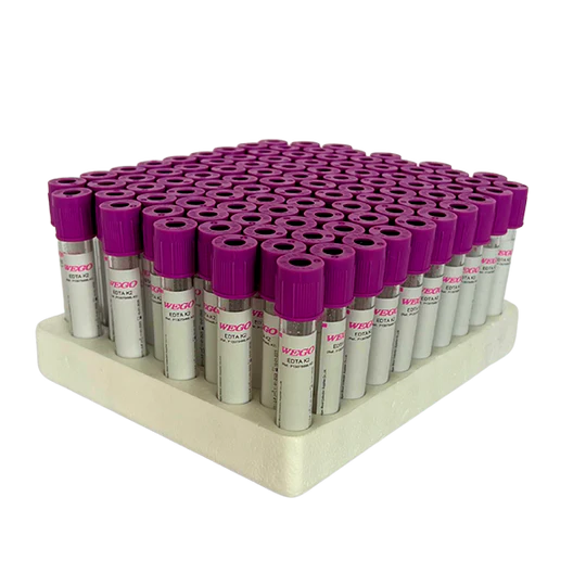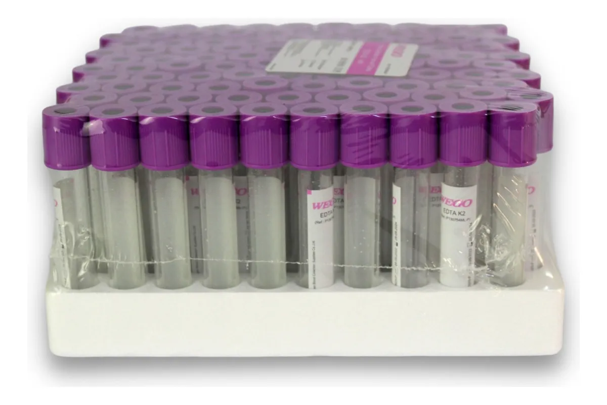 Tubo para toma y recolección de sangre EDTA K2 lila, de 4 ml (13 x 75 mm), Gradilla c/100 tubos marca WEGO