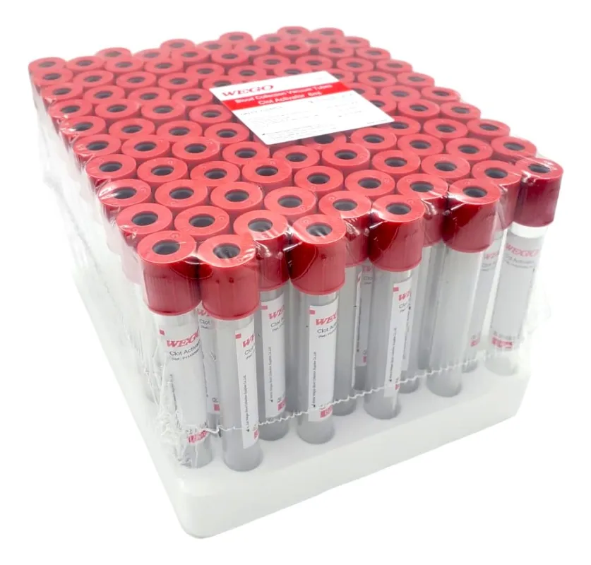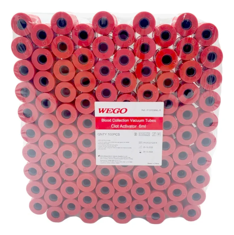 Este paquete incluye 100 tubos de recolección al vacío con un tapón rojo, cada uno con una capacidad de 6 ml y un activador coagulante que facilita la obtención de muestras de sangre. Su diseño de base redonda garantiza estabilidad durante su uso. Fabricados por la reconocida marca WEGO, estos tubos cuentan con un cierre a presión que asegura la integridad de las muestras. Son estériles y están elaborados en polipropileno, lo que los hace resistentes y seguros.